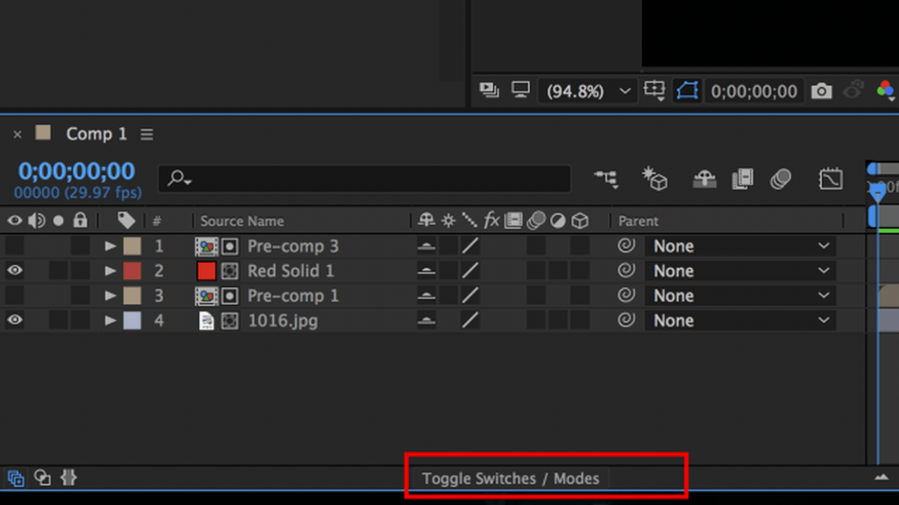 要呼叫出Track matte Key (動態遮罩),只要按下鍵盤的『F4』或者在Timeline面板中點選『Toggle Switches / Modes』。