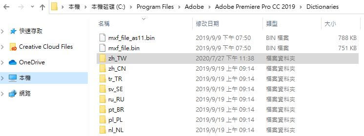 - 開啟Premiere Pro安裝資料夾中的Dictionaries中的Zh_TW資料夾。路徑如下:C:Program FilesAdobeAdobe Premiere Pro CC 2019Dictionarieszh_TW