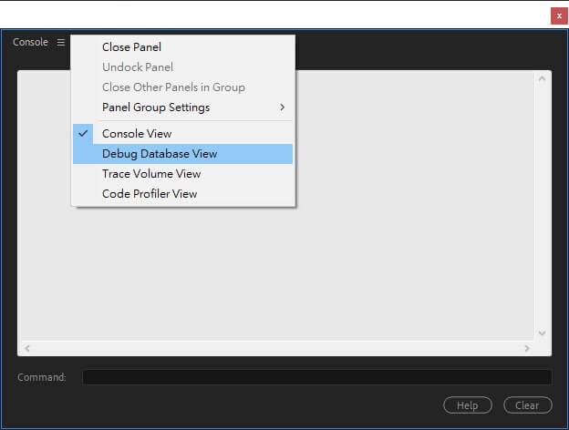 - 開啟Premiere Pro利用快速鍵Ctrl +F12,開啟『Console』面板。點擊Debug Database View功能。